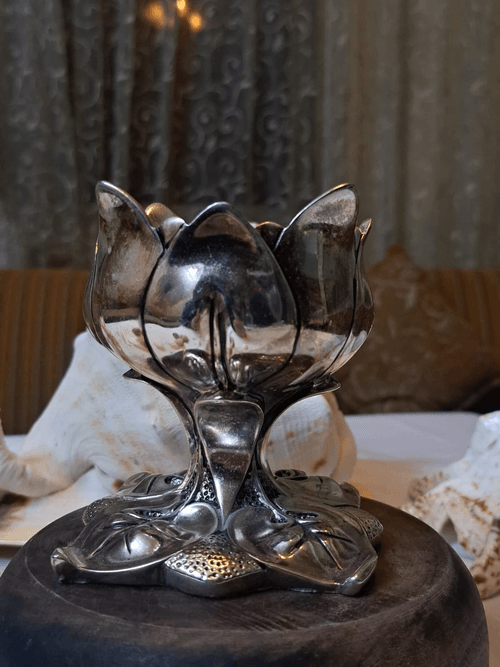 قطعة فنية معدنية فاخرة بتصميم مستوحى من زهرة اللوتس، منفذة بحرفية عالية وتفاصيل ناعمة تعكس الطابع ال