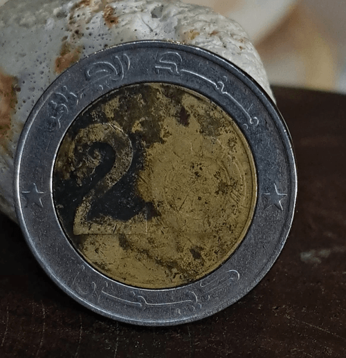 عملة جزائرية فئة 20 دينار ثنائية المعدن، تتميّز بظهور لون أسود داكن على الوجهين يمنحها حضوراً بصرياً قوياً وغير تقليدي. السطح ناعم وحريري الملمس مع لمعان معدني متجانس، وتظهر جهة الأسد بملامح ناعمة وغير حادّة نتيجة تداول طويل وهادئ، دون أي خشونة أو تلف في السطح. هذا الطابع الداكن المتناسق مع النعومة الواضحة يجعل القطعة مميّزة ومحبوبة لدى فئة من هواة جمع العملات الذين يفضّلون القطع ذات الطابع القوي والمظهر المختلف.