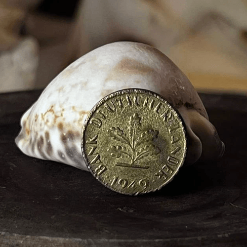 عملة ألمانية من فئة 10 فلس لعام 1949 تحمل تصميم غصن البلوط الشهير من إصدار Bank Deutscher Länder الوزن الأصلي تقريباً 4.00 غرام وتصنع عادة من خليط الألمنيوم مع البرونز وغير جاذبة للمغناطيس بينما هذه القطعة وزنها 3.87 غرام ومع ذلك تنجذب للمغناطيس مما يشير لاختلاف في السبيكة أو خطأ محتمل في عملية السك وتظهر آثار استخدام طبيعية تضيف للقطعة طابعاً تاريخياً أصيلاً مما يجعلها من