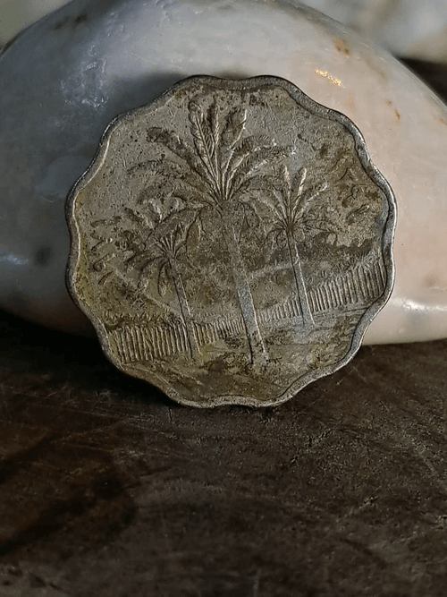 عملة 10 فلوس عراقية – 1971 أصلية من فترة الجمهورية العراقية، تتميز بالحواف المتموجة والتصميم الكلاسيكي المعروف لتلك المرحلة. يظهر على أحد الوجهين مشهد النخيل والعمارة التقليدية في دلالة على الهوية العراقية، بينما يحمل الوجه الآخر القيمة الاسمية والكتابات العربية. آثار التداول طبيعية ومتناسقة مع عمر القطعة، ما يمنحها طابعًا تاريخيًا حقيقيًا دون أي أخطاء سك أو ازدواج معدن. قطعة مناسبة لهواة جمع العملات العراقية والعملات المتداولة من سبعينيات القرن الماضي.