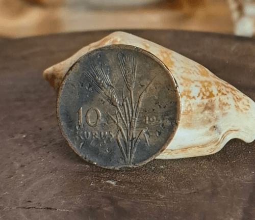 عملة تركية أصلية فئة 10 قروش تعود إلى منتصف القرن العشرين، يظهر على وجهها تصميم سنابل القمح رمز الزراعة والازدهار، وعلى الوجه الآخر الهلال والنجمة شعار الجمهورية التركية. مصنوعة من سبيكة برونزية، لا تنجذب للمغناطيس، وبوزن تقريبي حوالي 3 غرامات. قطعة قديمة أصلية مناسبة لهواة جمع العملات العالمية وعملات الشرق الأوسط. وزنها 3.87 تختلف عن وزنها الاصلي