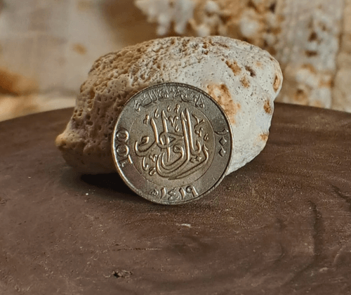 Original Saudi Arabian 100 Halala coin issued in 1419 AH, featuring the national emblem of Saudi Arabia with crossed swords and palm tree on the obverse. The reverse displays the denomination “100 Halala” in elegant Arabic calligraphy. Made of copper-nickel alloy, non-magnetic, with an approximate weight of 6.5 grams. A genuine Saudi coin, suitable for collectors of Middle Eastern and world coins.