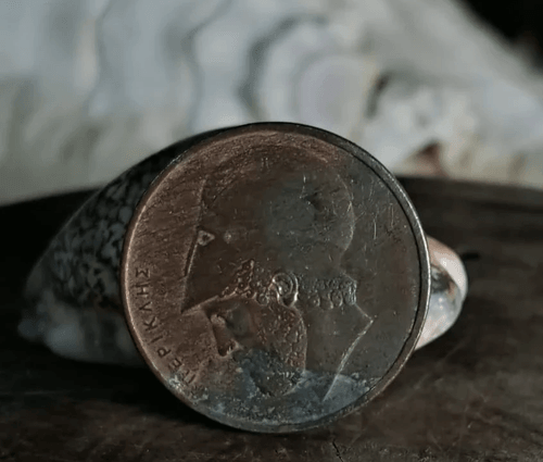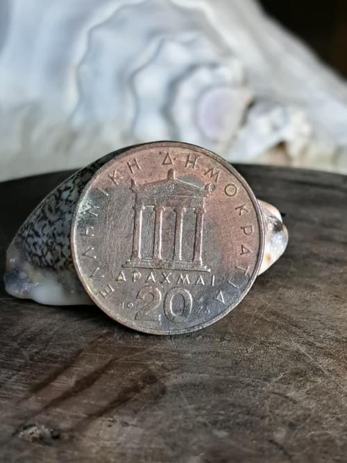 A vintage Greek 20 Drachma coin dated 1976, featuring the profile of an ancient Greek warrior on the obverse with detailed helmet engravings. Over time, the metal developed a natural dark patina that gives the coin a strong historical character. The reverse side presents a classical Greek temple with four columns, along with the inscription “ΕΛΛΗΝΙΚΗ ΔΗΜΟΚΡΑΤΙΑ – 20 ΔΡΑΧΜΑΙ” and the year 1976. A collectible piece reflecting Greek heritage and culture, with natural metal aging that enhances its visual appeal and display value. Link to the item: [insert your shop link here] worldwide shipping avail