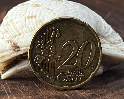 عملة يورو نادرة من فئة 20 سنت لعام 2002 تحمل خطأ واضح في النجوم المحيطة بالخريطة الأوروبية وازدواجية