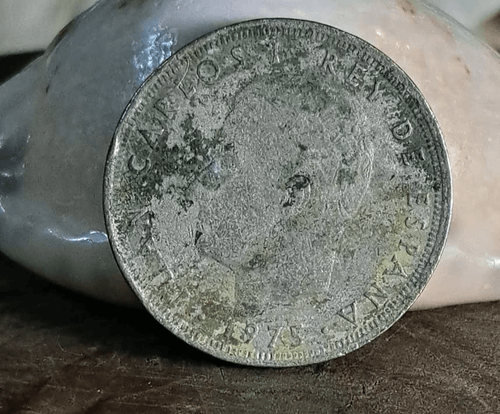 عملة إسبانية قديمة من فئة 25 بيزيتا لعام 1975 في عهد الملك خوان كارلوس الأول، تحمل على الوجه الأمامي صورة الملك مع عبارة JUAN CARLOS I REY DE ESPAÑA، بينما يظهر على الوجه الخلفي التاج الملكي فوق قيمة العملة 25 PTAS. القطعة تظهر عليها آثار الزمن وتعتيق طبيعي منح المعدن حضوراً تاريخياً مميزاً، ومع مرور السنين أصبح سطحها ناعم الملمس كأنه حرير مما يعطيها لمسة فريدة محببة لهواة الاقتناء. رابط القطعة: