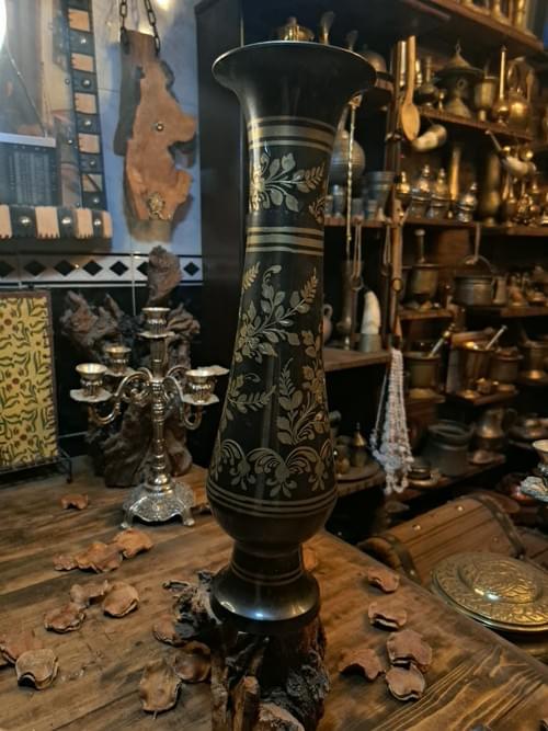 فازة أنتيك فاخرة مصنوعة من المعدن المنقوش يدويًا بزخارف نباتية أنيقة تعكس طابعًا تراثي