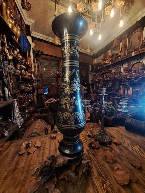 فازة أنتيك فاخرة مصنوعة من المعدن المنقوش يدويًا بزخارف نباتية أنيقة تعكس طابعًا تراثيًا كلاسيكيًا أصيلًا، تتميز بشكلها الانسيابي وقاعدتها الثابتة وتفاصيلها الدقيقة التي تمنحها حضورًا قويًا وفخمًا، قطعة نادرة ومميزة لعشّاق التحف والديكور الكلاسيكي، مناسبة للعرض في الصالونات والمكاتب والمجموعات الخاصة وتُعد إضافة راقية تحمل روح الزمن الجميل.