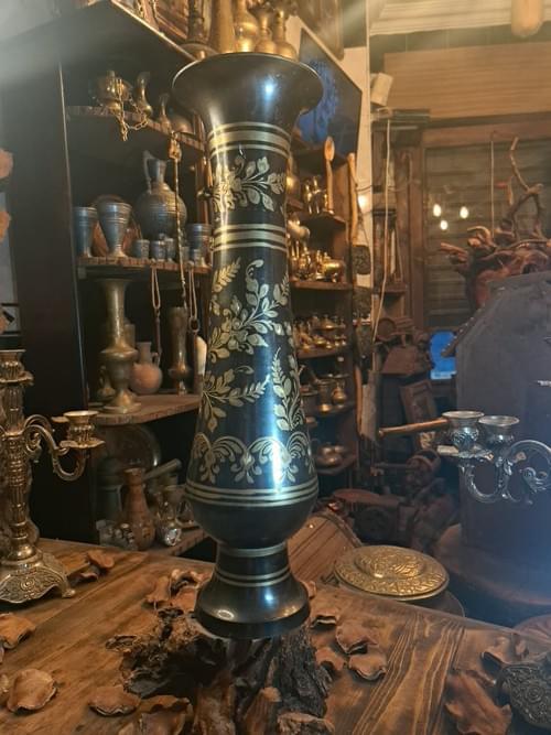 An elegant antique metal vase crafted from engraved metal with refined floral patterns reflecting a classic vintage character, featuring a graceful shape, solid base, and detailed workmanship that gives it a luxurious and timeless presence, a rare collectible piece ideal for antique lovers, classic interiors, and private collections.