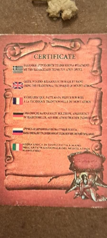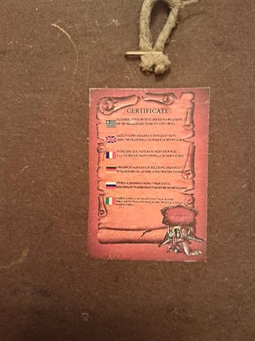 It comes with an accompanying certificate confirming that it is a handcrafted Greek wooden icon created using the traditional Mount Athos method.