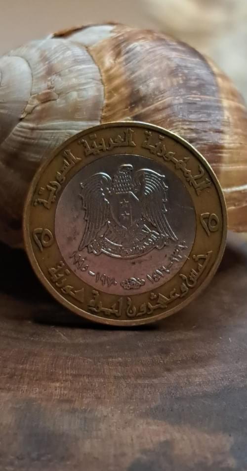 عملة ٢٥ ليرة سورية ثنائية المعدن بوزن يقارب 6.48 غرام وتحمل خطأ نادراً بوجود تاريخين هجري وميلادي