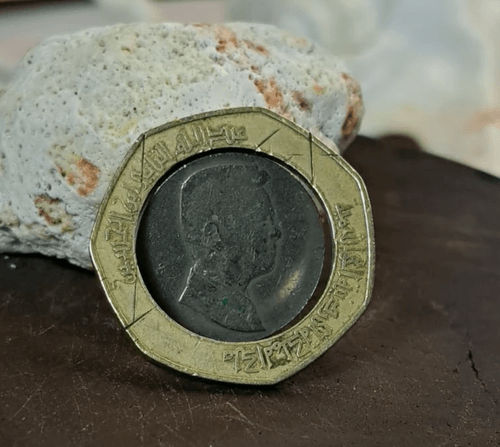 عملة أردنية فئة نصف دينار ذات تصميم ثنائي المعدن (حلق خارجي نحاسي أصفر وقلب داخلي فضي اللون)، وهذه القطعة تتميز بخطأ سك كبير حيث انفصل القلب عن الإطار الخارجي بشكل كامل، وهو خطأ نادر لأن العملة الأصلية تأتي ملتحمة بقوة ولا يمكن تفكيكها بسهولة، وزنها الإجمالي حوالي 9.50 غرام للحلقتين مع وجود تشحيطات وآثار ضغط واضحة مما يجعلها قطعة مميزة لهواة أخطاء سك العملات الأردنية. / A Jordanian Half Dinar bi-metal coin, featuring a brass-colored outer ring and a silver-tone inner core, displaying a major minting error where the core has fully separated from the outer ring. This is a rare striking anomaly, as original coins are strongly bonded and normally cannot separate. The total weight is approximately 9.50 grams, with visible scrape and pressure marks, making it a standout piece for collectors of Jordanian mint-error coins.