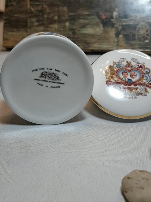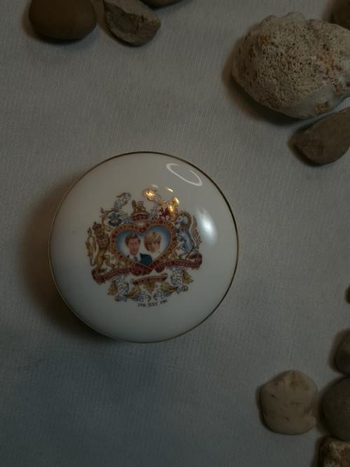 علبة خزف (Bone China) بريطانية أصلية وفاخرة، مصنوعة في إنجلترا من قبل Stratford Fine Bone China، ومخصّصة لإحياء ذكرى زفاف الأمير تشارلز والأميرة ديانا بتاريخ 29 يوليو 1981.
