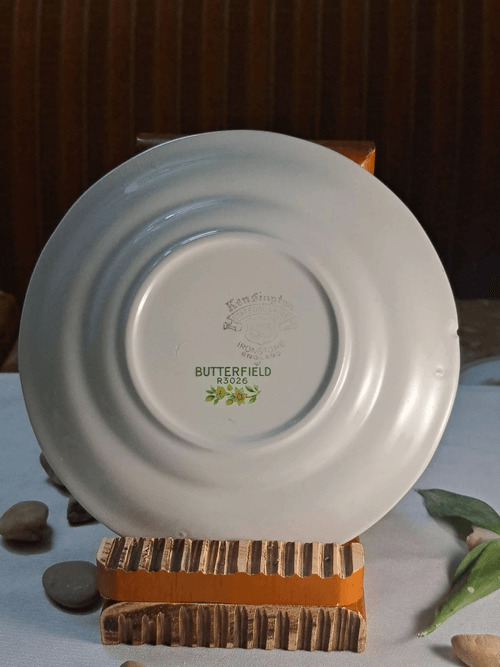 طبق بورسلان إنجليزي فينتاج أصلي يحمل نقش زهور صفراء أنيقة، ومختوم باسم Butterfield – Staff