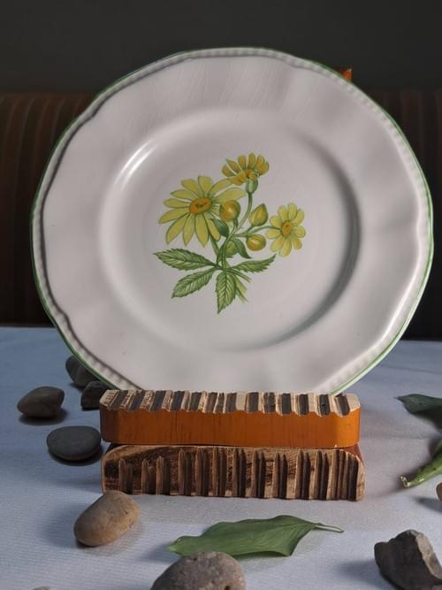 Vintage English porcelain plate featuring a delicate yellow floral design, marked by Butterfield Staffordshire Ironstone. A classic collectible piece reflecting traditional English tableware craftsmanship. Natural age-related crazing is present, adding authentic vintage character. Ideal for display or collectors of European porcelain.