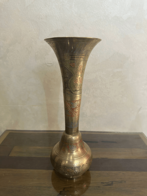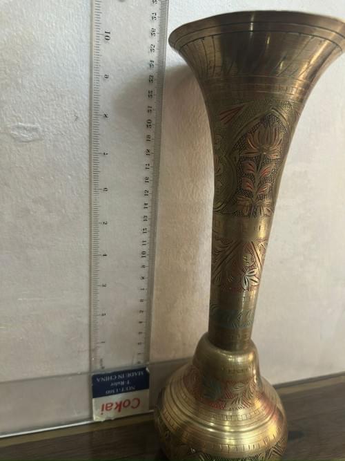 Vintage hand-engraved brass vase, 35 cm tall, featuring intricate floral and oriental patterns highlighted with