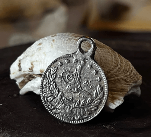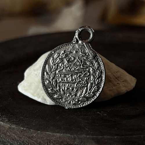 ميدالية عثمانية قديمة فضية تم تثقيبها وتعليقها كحُلي/تعويقة (واضح الحلقة بالأعلى).هي عملة عثمانية من فئة القِرش أو أجزاء القِرش (نهاية القرن 19 – بداية القرن 20)، وتحمل: