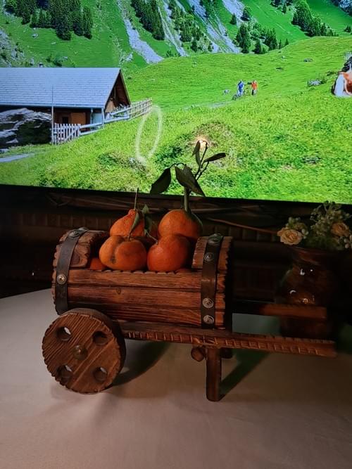 عربة خشبية ديكورية مصنوعة يدويًا من الخشب الطبيعي، تجمع بين الجمال الريفي والاستخدام العملي.