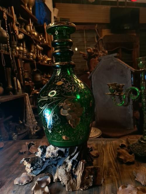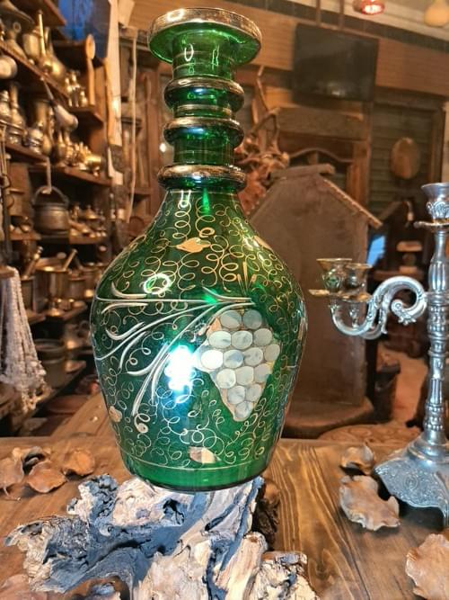 فازة زجاجية قديمة من الزمن الماضي بلون أخضر زمردي مميز، مزخرفة يدويًا برسومات نباتية دقيقة ولمسات فنية كلاسيكية تعكس روح الحِرف التقليدية. تصميمها الأنيق ورقبتها الطويلة يمنحانها حضورًا فخمًا، بينما آثار الزمن الطبيعية تضيف لها قيمة تاريخية وأصالة واضحة. قطعة ديكور نادرة تناسب عشّاق التحف والفن القديم، مثالية للعرض أو لإثراء مجموعة مقتنيات مميزة.