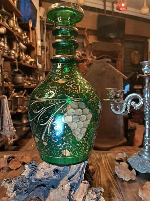 An elegant emerald-green glass vase featuring delicate hand-painted floral motifs and classic craftsmanship. Its refined silhouette and tall neck give it a timeless presence, while natural age marks enhance its authenticity and historical charm. A rare decorative piece, perfect for collectors of antiques and lovers of vintage art glass—ideal for display or as a standout collectible.