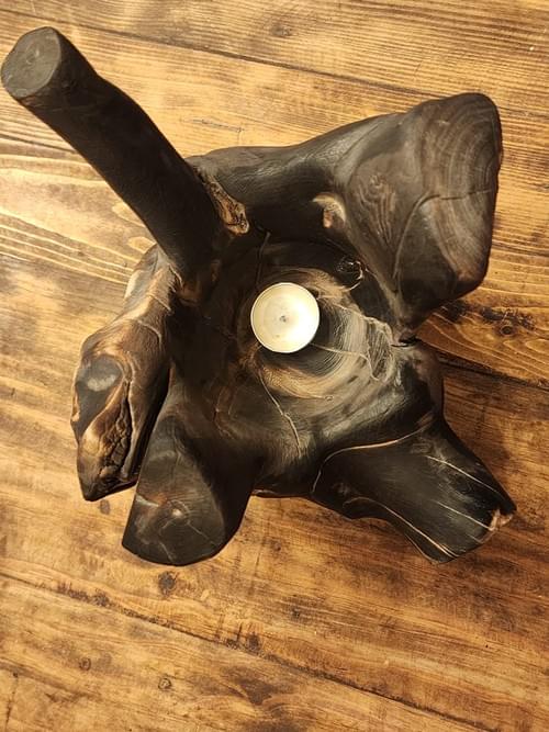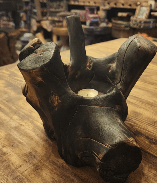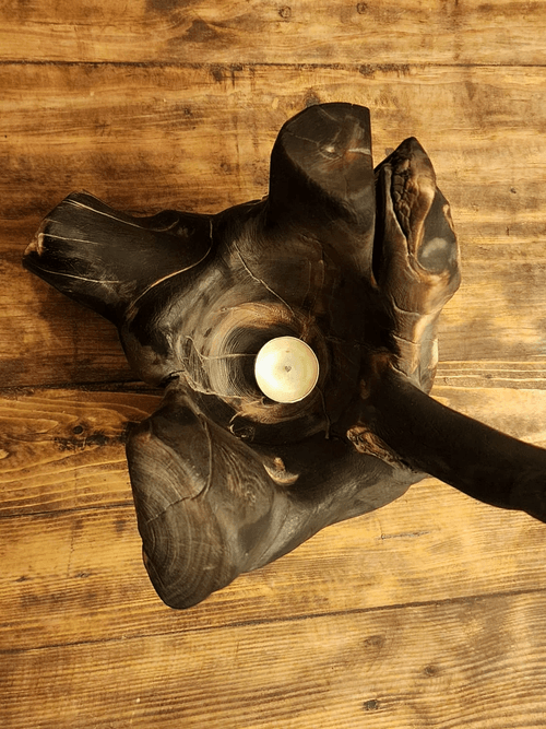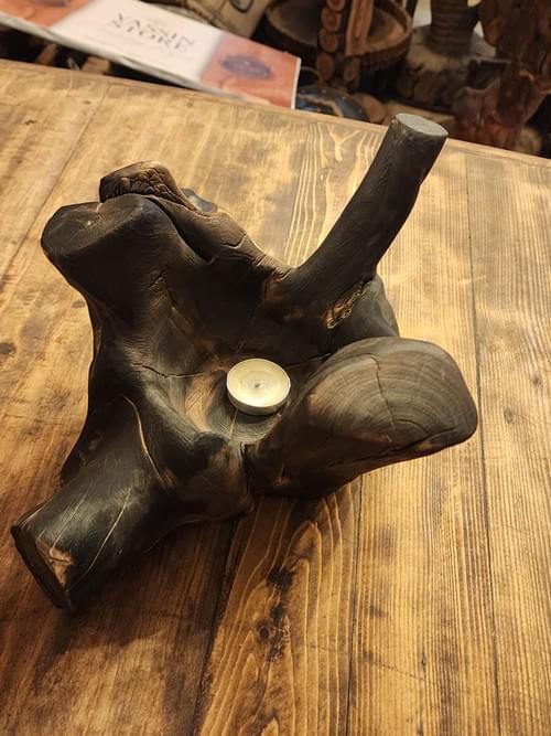 A unique handcrafted wooden piece made from a natural tree root, featuring organic details that reflect the beauty of nature. Designed as a distinctive candle holder, it combines simplicity with bold character, creating a warm and calming atmosphere when lit. Each angle tells a different story, making it a perfect choice for those who appreciate natural decor and artistic handmade touches.