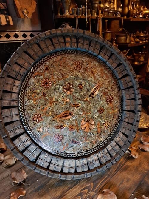 A rare handcrafted decorative piece combining engraved metalwork with a thick wooden circular frame that gives depth, character, and a unique antique feel. The detailed floral patterns inside the plate showcase traditional craftsmanship and create a timeless artistic presence. Perfect as a statement display on a table or as a hanging wall piece to elevate any interior with classic oriental heritage and unique handmade charm.