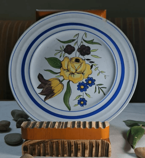 صحن بورسلان فني نادر بتصميم يدوي راقٍ، مزين برسومات زهور ملونة بتناغم جميل بين الأصفر، الأزرق، والأخضر، مع إطار دائري مزدوج باللون الأزرق يبرز جمال القطعة ويمنحها طابعًا كلاسيكيًا أنيقًا.