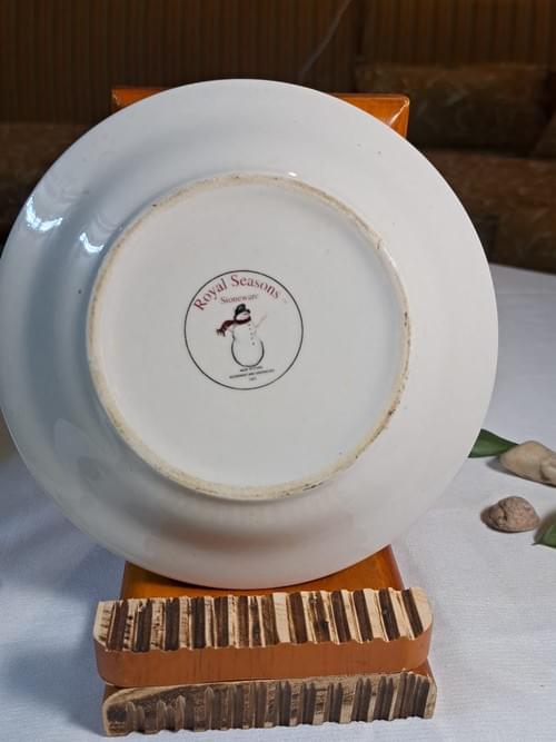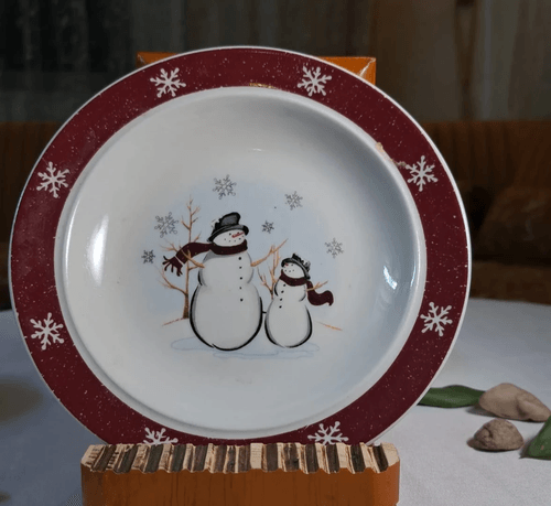 صحن بورسلان موسمي بتصميم رجلَي ثلج ❄️، قطعة أنيقة بطابع شتوي دافئ مناسبة للديكور أو التقديم خلال موسم الكريسماس. يتميز بإطار أحمر مع زخارف رقاقات الثلج، وتصميم غير متوفر بنفس الشكل بالضبط. القطعة بحالة ممتازة وخالية من الكسور.