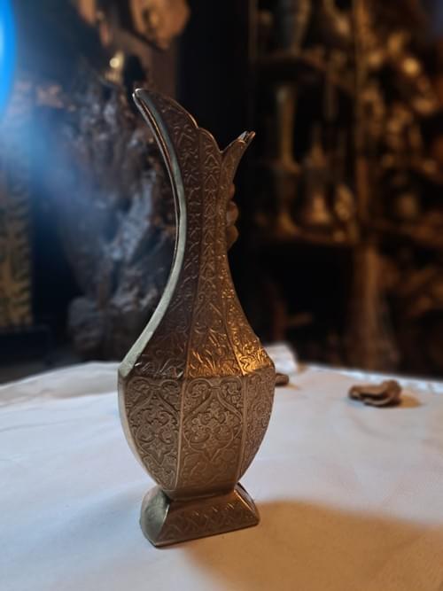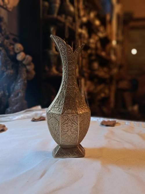 Luxury Oriental Brass Vase inspired by classic Islamic design, fully engraved with intricate handcrafted patterns from base to neck. Its elegant curved silhouette and dual spout opening create a royal presence whether displayed alone or styled with dried flowers. The detailed floral motifs reflect authentic Middle Eastern craftsmanship, making it a refined statement piece for luxury interiors, offices, or private antique collections. Solid, durable, and rich in character, this is a timeless decorative artifact for serious collectors of Eastern heritage antiques.