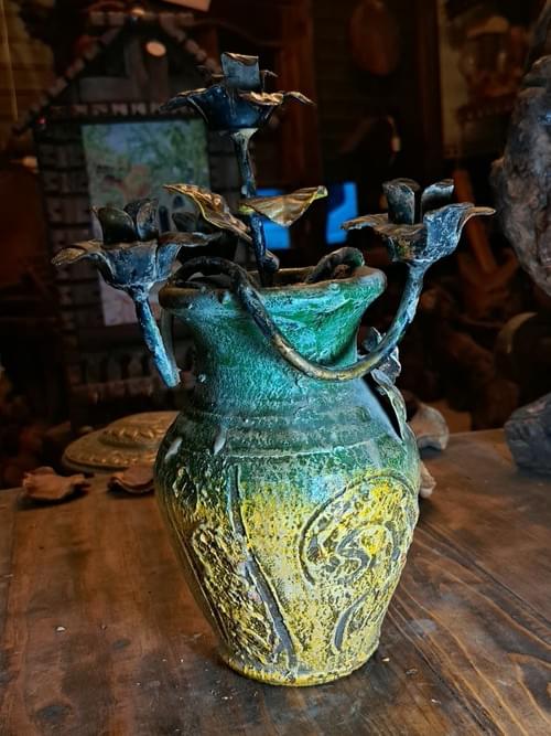 قطعة فنية نادرة تجمع بين الزخرفة اليدوية والطابع المعدني العتيق، عبارة عن مزهرية فريدة يتوسطها شمعدان معدني متعدد الأذرع بتصميم زهري، مع طبقة تعتيق طبيعية (Patina) تمنحها حضورًا تاريخيًا قويًا.
