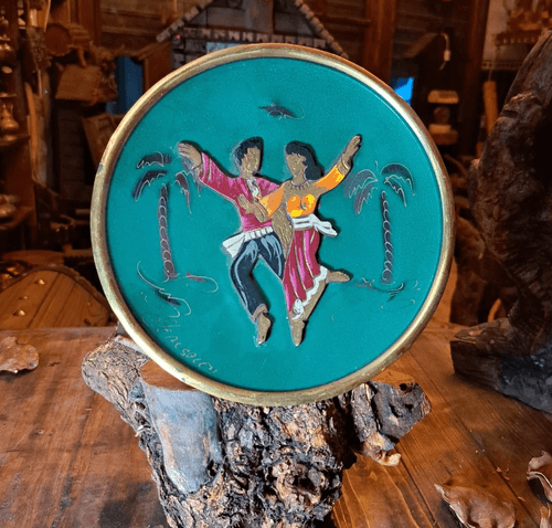 لوحة/صحن ديكور فني قديم بتصميم راقصين وخلفية تركواز، موقّعة يدويًا من الفنان (L. Meyer / Meier)، قطعة زخرفية تعود للنصف الثاني من القرن العشرين. تم البحث ولم يتم العثور على قطعة مطابقة بنفس التوقيع والتصميم على المواقع حتى الآن.