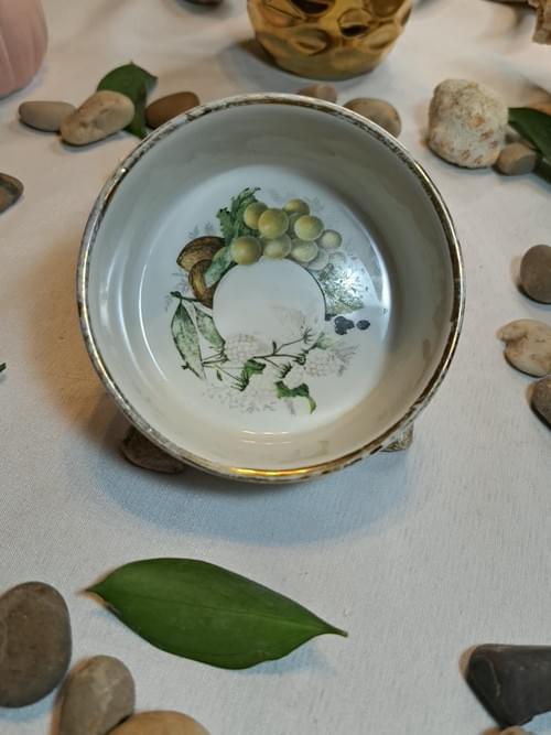 طبق بورسلان إنجليزي قديم مزخرف بعنقود عنب وثمار موسمية بتفاصيل دقيقة تمنح القطعة طابعاً ريفياً دافئا