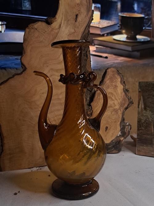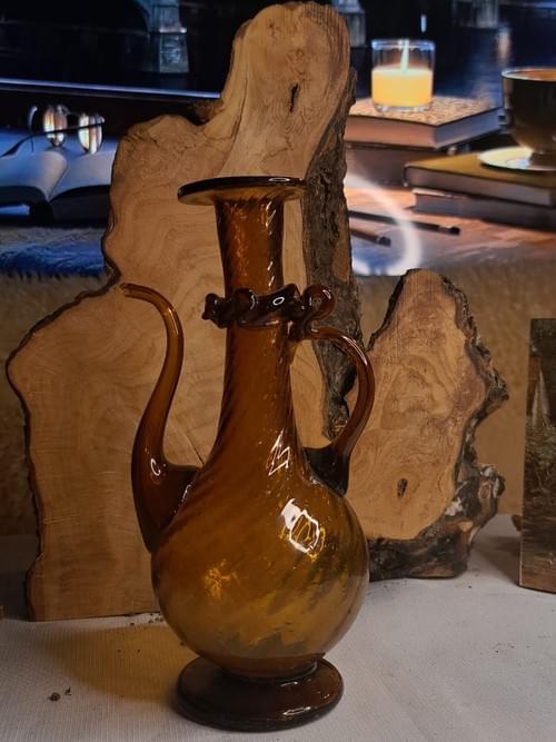 إبريق زجاجي فني قديم – بلون العنبر قطعة زجاجية راقية مصنوعة يدويا من الزجاج المنفوخ بلون العنبر