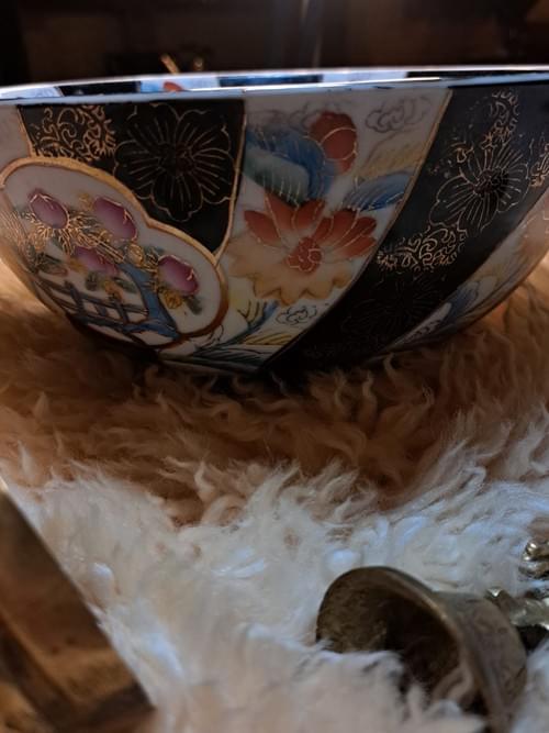 A refined Asian porcelain piece, hand-decorated in a classic style with intricate floral motifs and elegant gold detailing. The harmonious blend of blue, yellow, and black tones gives this item a timeless and luxurious character.