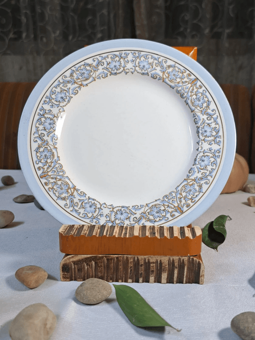 صحن بورسلان إنجليزي أنيق من توقيع J&G MEAKIN – England بتصميم كلاسيكي راقٍ يحيط به إطار مزخرف بلون أزرق فاتح مع لمسات ذهبية تعطي إحساس الفخامة الملكية. القطعة تعود لخط إنتاج Athena المعروف بتفاصيله الدقيقة ومظهره النظيف الذي يناسب غرف الجلوس، الكافيهات المنزلية، أو كقطعة ديكور على رف المطبخ.