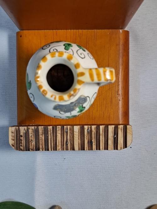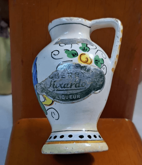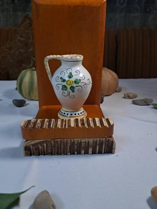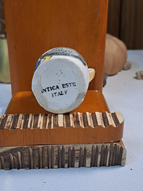 قطعة فخار إيطالية نادرة بلمسة فنية قديمة تحمل توقيع Leonardo / Antica Este – Italy مع زخارف يدوية ملوّنة بتقنية تقليدية تعود لمدارس الفخار الكلاسيكية في شمال إيطاليا. يظهر على سطحها Craquelure طبيعي (شقوق دقيقة بالعمر) يمنحها قيمة فنية وجمالية عالية ويؤكد أصالتها الزمنية، مع بقايا ملصق قديم يدل على استخدامها سابقًا كوعاء صغير لمشروب liqueur، ما يجعلها قطعة تذكارية فريدة لهواة التحف وCollectors.