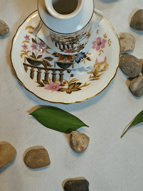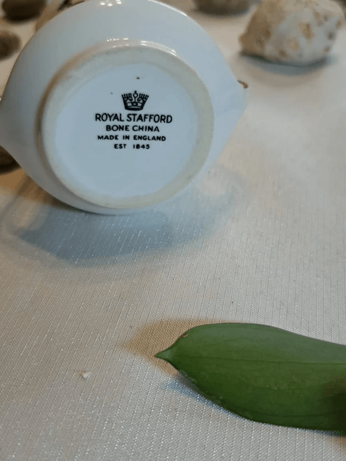 القطعة صناعة إنجليزية أصلية ومختومة بالختم الرسمي: ROYAL STAFFORD BONE CHINA – MADE IN ENGLAND – EST 1845، ما يؤكد أصالتها وجودتها العالية.