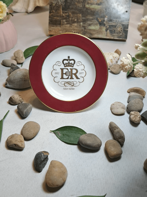 قطعة بورسلان بريطانية أصلية مميّزة من شركة Wedgwood، صُنعت خصيصًا بمناسبة اليوبيل الفضي للملكة إليزابيث الثانية (1952–1977)، تحمل شعار ER والتاج الملكي مع عبارة Silver Jubilee، تتميّز بإطار أحمر فاخر مع حواف مذهّبة أنيقة، ومصنوعة من Bone China عالي الجودة، تحمل ختم الشركة الأصلي من الخلف Made in England، قطعة تذكارية راقية لهواة التحف الملكية والبورسلان البريطاني، مناسبة للعرض والاقتناء ضمن المجموعات الخاصة.