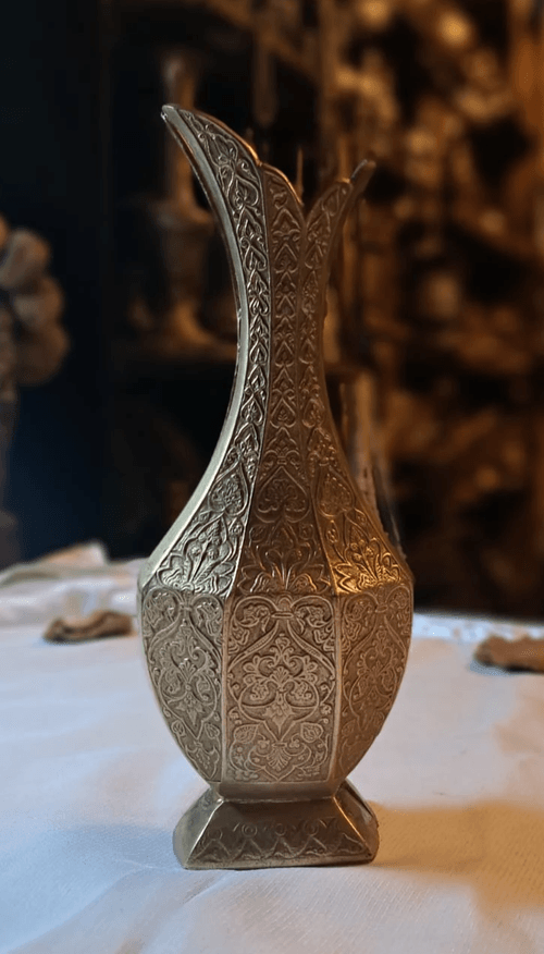A luxurious brass vase featuring an elegant design inspired by classic oriental style, highlighted by hand-engraved patterns and fine detailing that add a refined artistic touch.